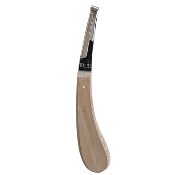 Profesjonalny nóż do korekcji racic z ergonomicznie zaprojektowaną drewnianą rękojeścią, zapewniającą pewny chwyt i wygodę użytkowania.