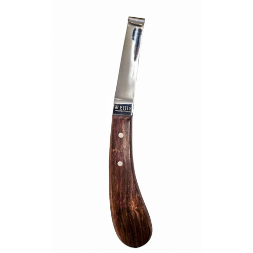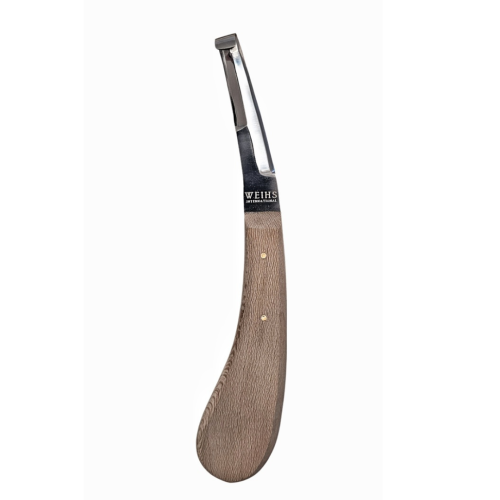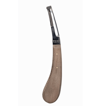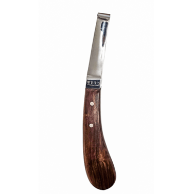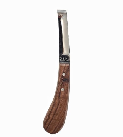 Profesjonalny nóż do korekcji racic z ergonomicznie zaprojektowaną drewnianą rękojeścią, zapewniającą pewny chwyt i wygodę użytkowania