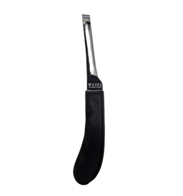 Solidny nóż do korekcji racic z ergonomiczną rękojeścią wykonaną z wytrzymałego czarnego tworzywa sztucznego o porowatej powierzchni, zapewniającą komfort użytkowania oraz pewny chwyt.